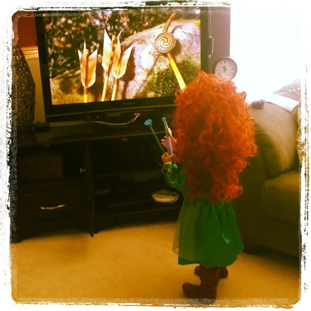 Here she is, the perfect dress with the perfect hair, standing there, listening to the music on the opening menu for the movie Brave, ready for her fairytale to begin. She IS Merida, after all. I mean the girl even had the bow and arrow to prove it!